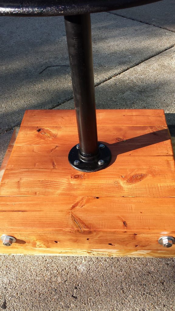 Труба ввинчивается во фланец с одного конца, и во фланец основания – с другого. Фланец основания закрепляется болтами и шайбами. Их я тоже покрыл краской.