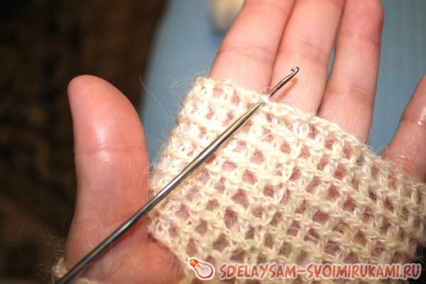 Теперь вяжем пальцы. Начнем с указательного. От места соединения рядов – шва (он находится на ладони), отступаем 2 клетки влево и присоединяем нить.