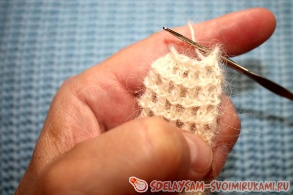 Затем от места соединения провязываем 2 клетки (это у нас идет уже 5-й ряд). И сразу делаем разбавку для большого пальца руки.