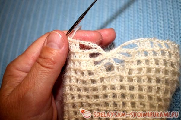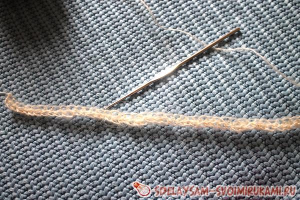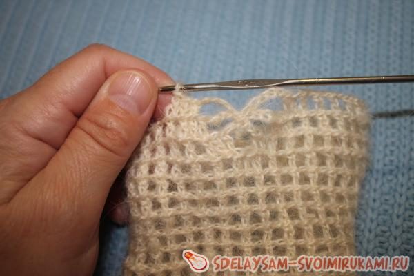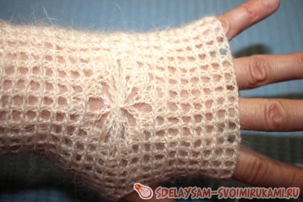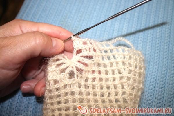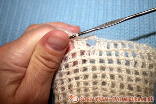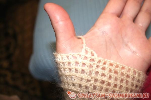 Затем по кругу выполняем филейную вязку. Необходимо провязать 3 или 4 ряда. В зависимости от размера ладони. Чем она меньше, чем меньшее количество рядов нужно сделать.