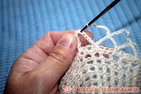Сначала одной петлей, в следующем ряду – тремя, а в третьем – пятью петлями. Затем рисунок идет на сужение. Тогда в следующем ряду ВП необходимо соединить тремя петлями, а затем – одной.