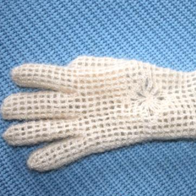 На пару перчаток понадобится около 40-50 грамм тонкой пряжи из белого козьего пуха. Прядение выполняется на х/б нитку размера № 40-50, и крючок № 1,5-2