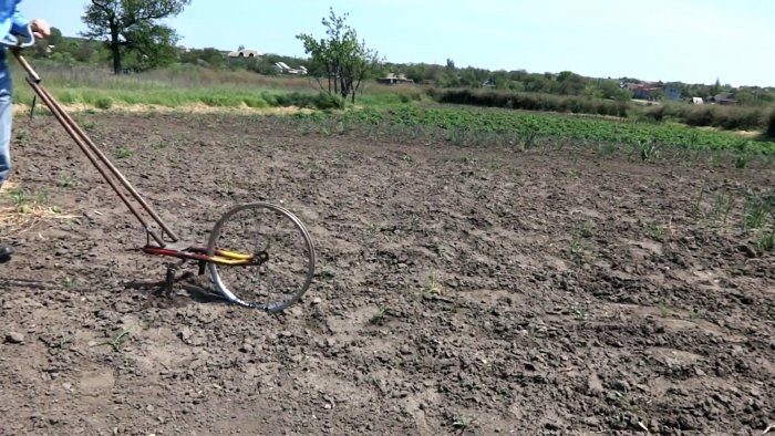 Для данной самоделки от велосипеда используется переднее колесо радиусом 210 мм, вилка к нему и руль. У вилки обрезается шток, и на нее приваривается площадка из листовой стали. К самой пластине привариваются под углом 2 трубы для закрепления руля. Их длина подбирается под рост того, кто будет пользоваться культиватором. Чтобы трубы держались крепче, под них нужно сделать распорки из арматуры. Вверху трубы сводятся вместе, и к ним приваривается велосипедный руль.