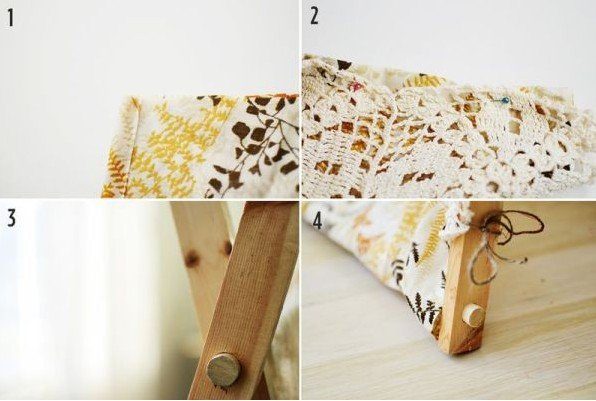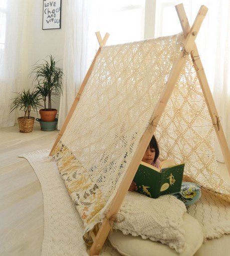 Создавая свой уголок — палатку для ребенка можно использовать любые легкие ткани, те же скатерти для дома могут пригодиться. Или вязанная ажурная ткань.