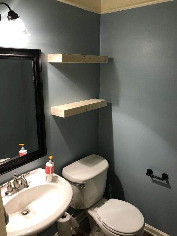 Перед тем, как устанавливать полки, я обработал их наждачной бумагой, а затем отполировал специальным составом на основе пчелиного воска. Это придало изделиям максимально естественный вид. Остались небольшие остатки древесины, поэтому, используя L –образные кронштейны, я прикрепил один кусочек над держателем туалетной бумаги, чтобы не допускать ее самопроизвольного разматывания.