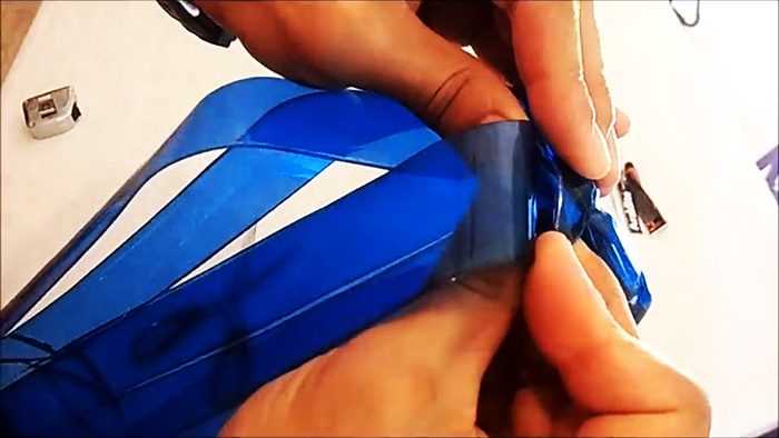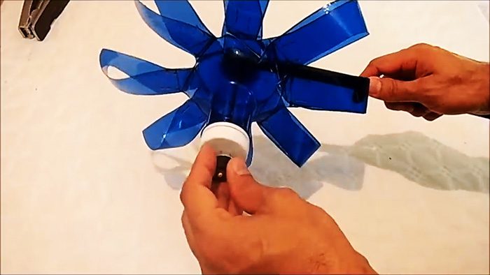 Если сдавить бутылку, чтобы свести дно и горлышко, при этом немного ее провернуть, то подогнутые полосы сформируют лопасти. Каждую из них нужно зафиксировать, пробив канцелярским степлером. На одну лопасть вбивается по 2 скобы.