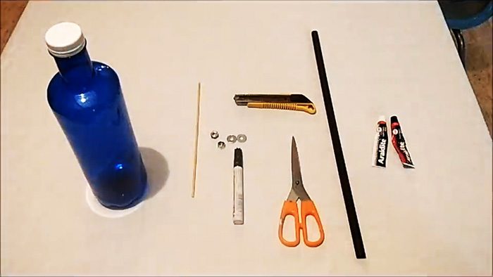 Затем необходимо закрепить ось на стойке. В ее качестве подойдет пластиковая трубка или ровная палочка. В стойке ближе к верху делается узкое отверстие и в него под прямым углом вставляется шпажка. На ось надевается шайба и гайка, после чего насаживаются лопасти дном до стойки.