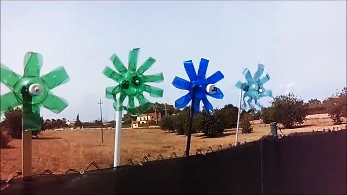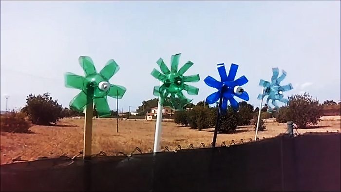 Из цветных пластиковых бутылок получаются очень красивые и быстрые садовые ветряки. Форма бутылки позволяет сформировать широкие лопасти, реагирующие даже на слабый ветер.