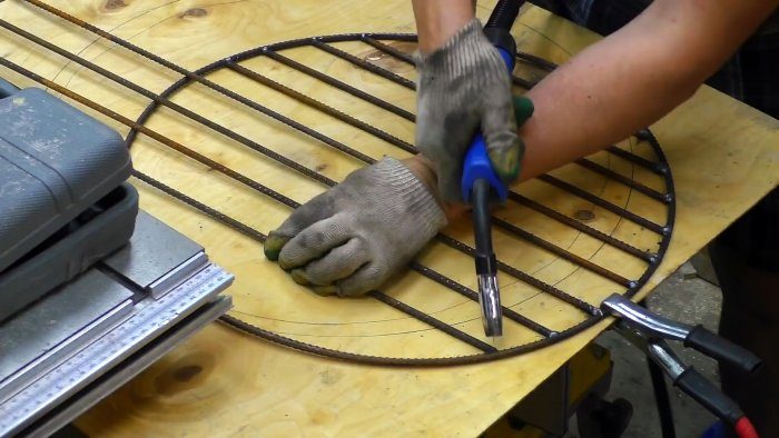 Затем нужно сделать колосники. Для этого из арматуры сгибается кольцо по внутреннему диаметру бочки. На него навариваются прутки с шагом в несколько сантиметров. После готовности колосники вставляются в бочку и привариваются немного выше боковой дверцы.