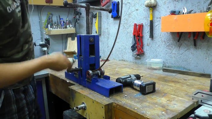 Для удобного перекатывания бочки требуется сделать транспортировочную ручку. Она выгибается из арматуры. Сгибается П-образная заготовка и вваривается на бочку со стороны дымохода. На нее можно надеть шланг, чтобы рельеф арматуры не давил ладонь.