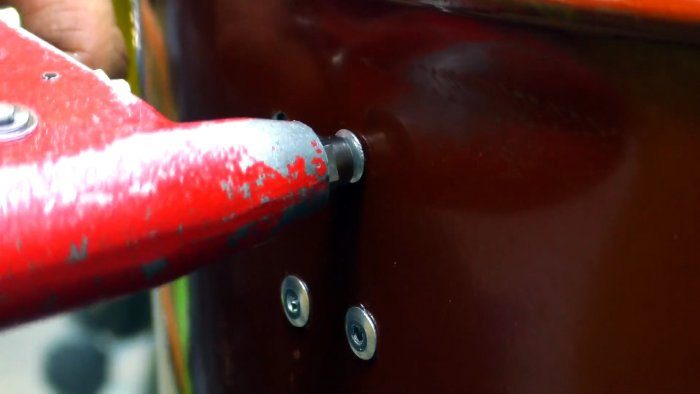 На стенку бочки с противоположной стороны от петель на заклепки устанавливается монтажный уголок. Он послужит ограничителем для дверцы.