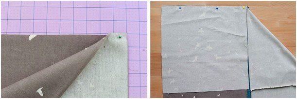 4. К двум квадратам, соединенным молнией, пришейте еще два квадрата, чтобы получить одну большую линию из четырех квадратов. Первый квадрат станет верхом изделия, второй – стороной, третий – низом и четвертый – стороной. Теперь нам нужно к третьему квадрату (низу) пришить с каждой стороны еще по квадрату. Помните, что швы выполняются по изнаночной стороне ткани.