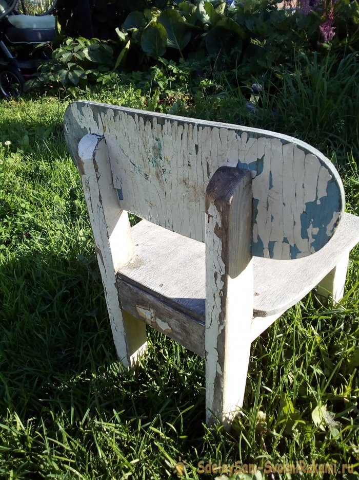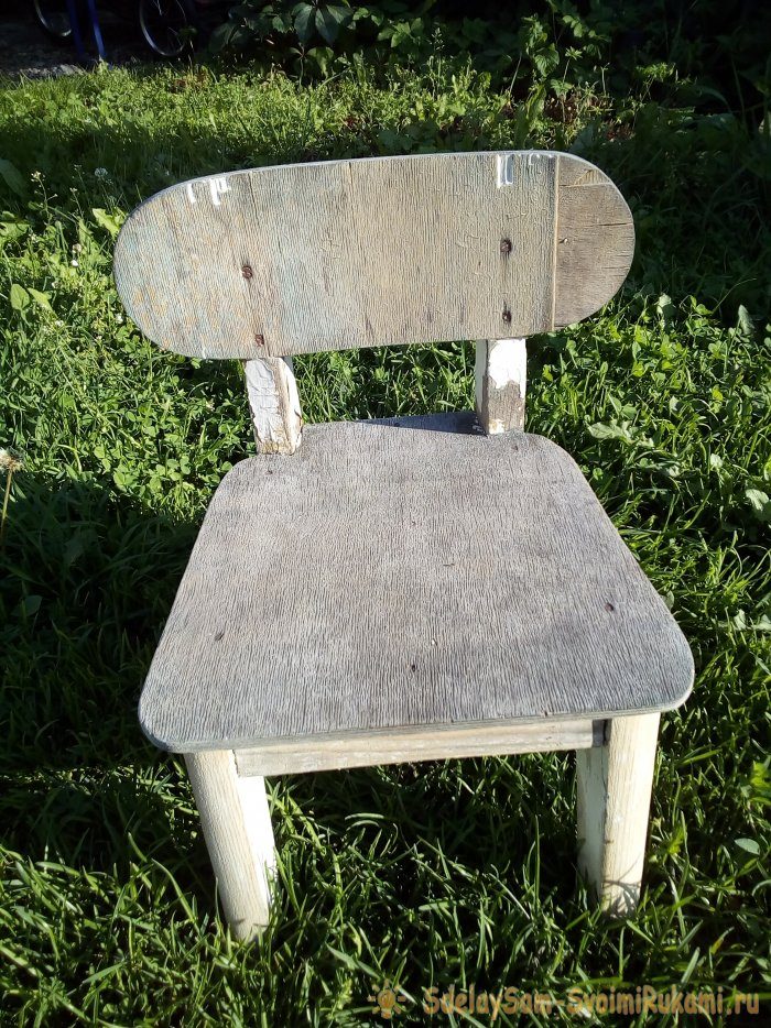 Если у вас завалялся старый деревянный стульчик небольших размеров, то его можно восстановить нехитрым способом и с применением всем доступных материалов. Наша история была такова: у нас на даче валялся сосланный детский стульчик.