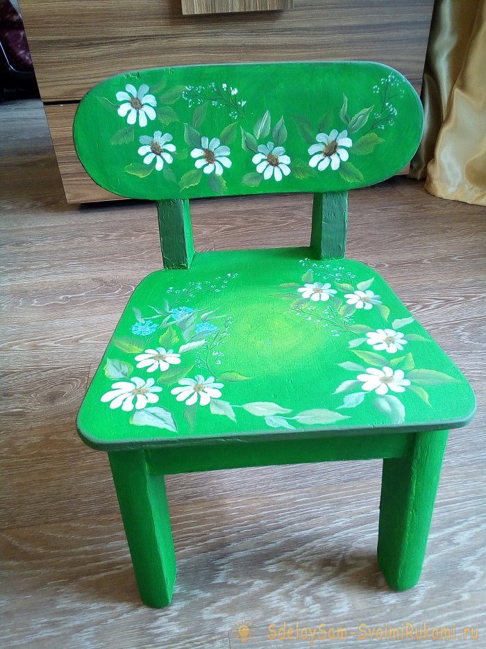 Затем покрыла весь стульчик зеленой акриловой краской. Покрывать пришлось на три слоя.
