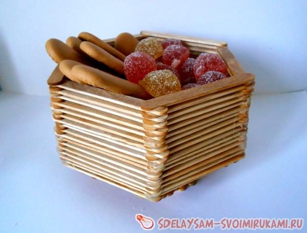 Используя необычные материалы в работе, порой получаются интересные и уникальные вещи. Так случилось и с этой вазой-конфетницей, созданной из обычных палочек от мороженого. Не затратное и уж точно неординарное изделие. А для работы нам понадобятся палочки и клеевой пистолет.