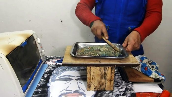 Как только масса в духовке расплавится и станет текучей, она извлекается и выливается в одну из форм. Для этого нужно использоваться деревянную лопатку, но стараться поменьше перемешивать массу. С ее помощью пластик равномерно распределяется по дну емкости. Далее сверху накрывается вторая форма и придавливается руками с легкой вибрацией, чтобы равномерно распределить материал.