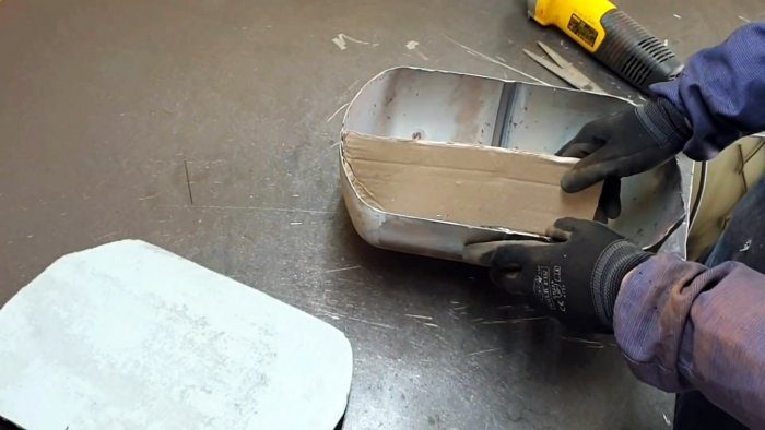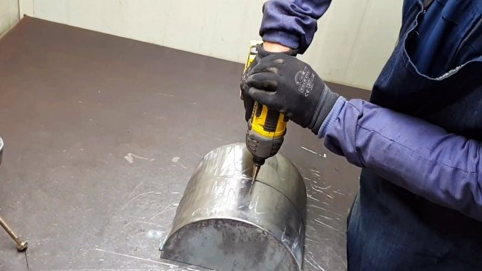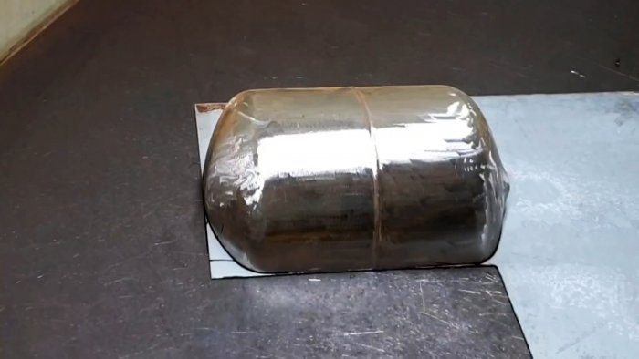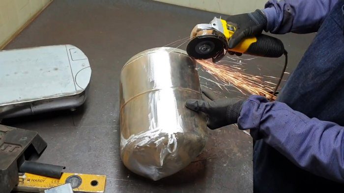 Из второй половины баллона делается крышка для духовки. Для этого у нее нужно срезать один скругленный торец. Затем он глушится листовой сталью.