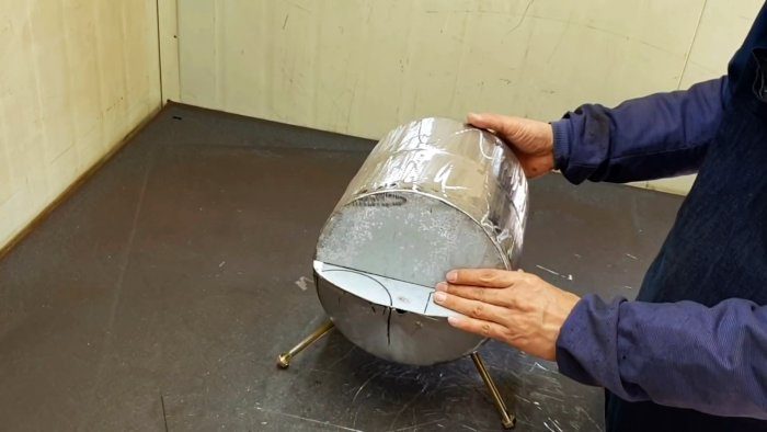 Далее к полученной заготовке привариваются ножки. В их качестве можно использовать длинные болты. Чтобы их прикрепить, нужно приварить ко дну гайки, в которые и будут вкручиваться болты. Такое крепление позволит их снимать для компактного хранения печи.