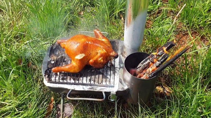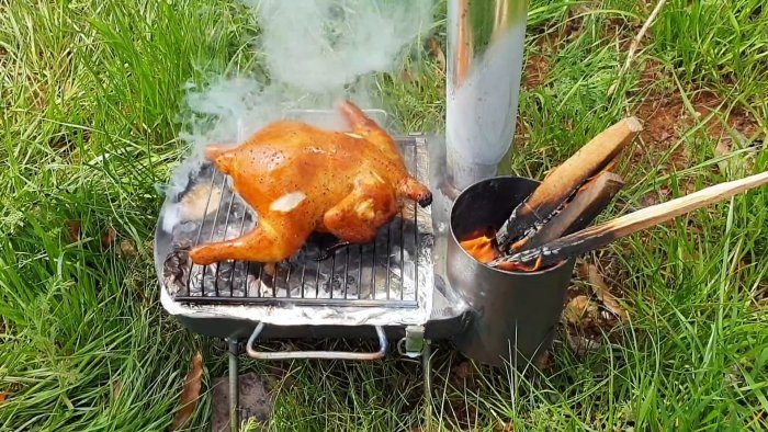 Если накрыть ее крышкой, то получается духовка. При использовании ее в таком режиме важно укладывать продукты на решетку, чтобы они не пригорали. Если при запекании будет капать жир, то снизу можно подстилать фольгу и поверхность под ней останется чистой. Пепел вытрушивается из топки переворачиванием духовки.