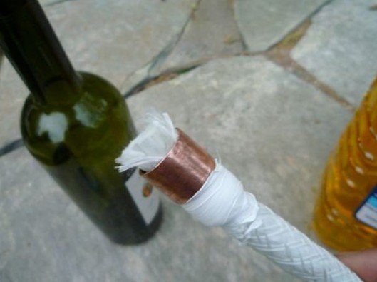 Они смотрятся романтично, и добавляют теплоту и стиль дому. Чтобы сделать подвесные светильники, нужны винные бутылки, фитиль, медные муфты, нейлоновая защитная лента.