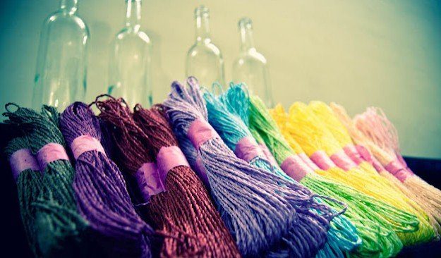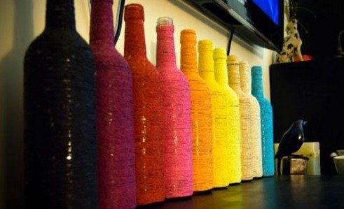 Пустая бутылка, как таковая, не совсем произведение искусства, но с небольшой нашей помощью онп может стать красивым украшением интерьера. Например, можно обернуть бутылки цветными нитками ( о том, как упаковать веревками бутылки думаю Вы уже знаете), и поставить их на полке.