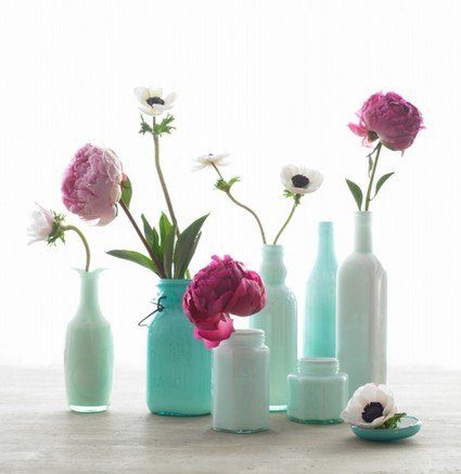 Еще одна интересная идея заключается в использовании пустой бутылки, в качестве вазы для цветов. Конечно, для этого сначала придется сделать им должный макияж. Промойте бутылки внутри и снаружи водой с мылом; дайте высохнуть. Затем залить небольшим количеством поверхность краски кондиционер, эмали для стекла.
