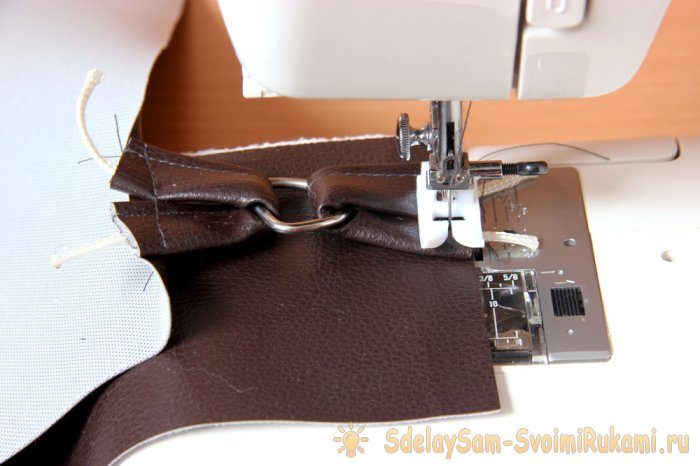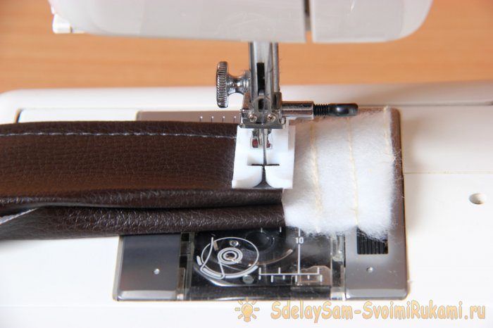 Ставим на минимальный показатель прижим лапки швейной машины. На нижнем срезе лямки подворачиваем вовнутрь припуск дерматина и сострачиваем детали.