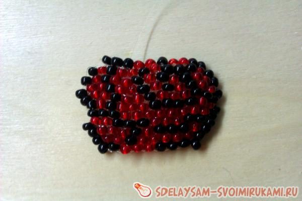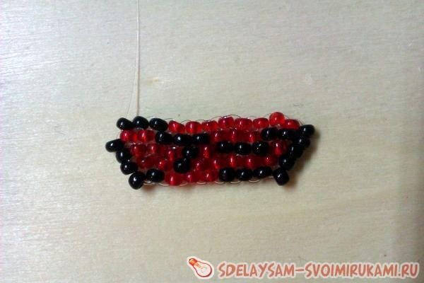 В конце ряда, чтобы прибавить одну бисерину, нужно два раза разными бисеринами дополнить ряд. То есть у нас получается, что в последний проем лески мы добавляем и 1 черную, и 1 красную бисерины, но каждую по очереди.