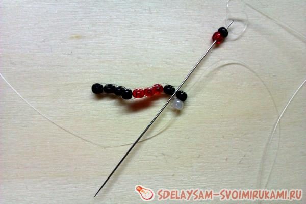 4. Во время плетения серьги мы будем как прибавлять, так и убавлять количество бисера. Делать это совсем не сложно. Набираем на иглу 1 черную и 1 красную бисерины. Сквозь бисер теперь мы не будем проходить. Нас интересует только леска над ними. Набранные бисерины выводим через первый проем лески и вводим иглу во вторую набранную бисерину. Должно получиться вот так.