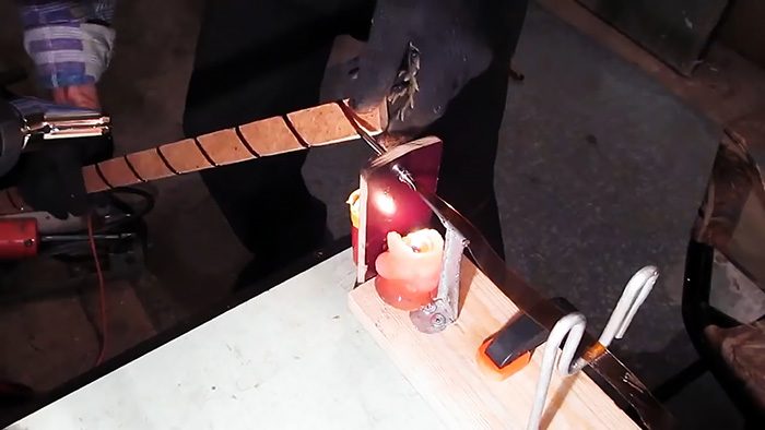 Конусный носик корпуса укорачивается таким образом, чтобы диаметр выходного отверстия составил 3-4 мм. Входное отверстие корпуса нужно немного развальцевать. Доработанный корпус закрепляется на подставке. Затем в него не до конца вставляется гвоздь, для которого делается отдельная стойка. Суть устройства в том, что при протягивании через него нагретой ленты она начнет скручивать в трубочку диаметром 3-4 мм.