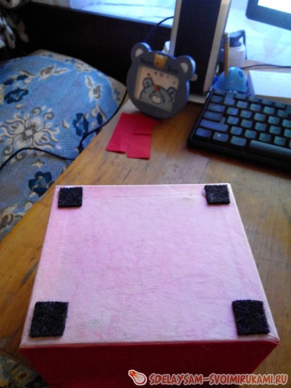 6. На нижнюю стенку коробки наклейте небольшие отрезки ткани для удобства в эксплуатации. Можно использовать ткань, которую использовали для создания внутренних отсеков.