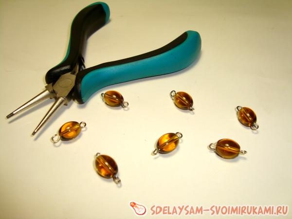 С помощью соединительных колечек прикрепляем цепочки к крайним янтарным бусинам.