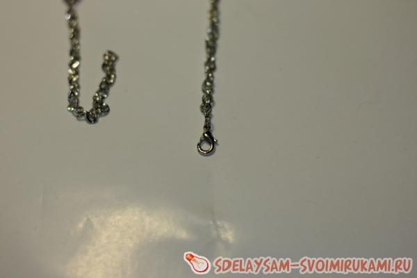 Нам осталось лишь прикрепить застежку. Я выбрала карабин. Крепим его с помощью соединительного кольца к крайнему звену одной из цепочек.