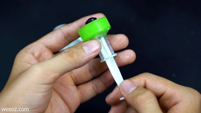 Вставим обрезок шприци и зафиксируем для герметичности горячим клеем.