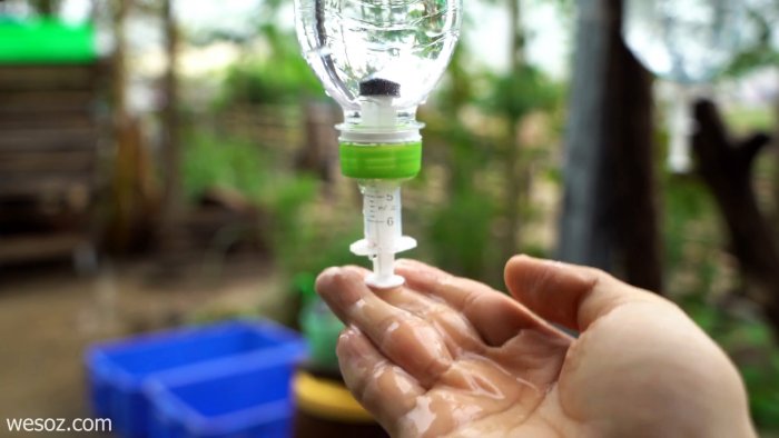 Теперь стоит притронутся к клапану руками, вода начинает течь. Чтобы ускорить ее вытекание сделайте небольшой прокол в верхней части бутылки.