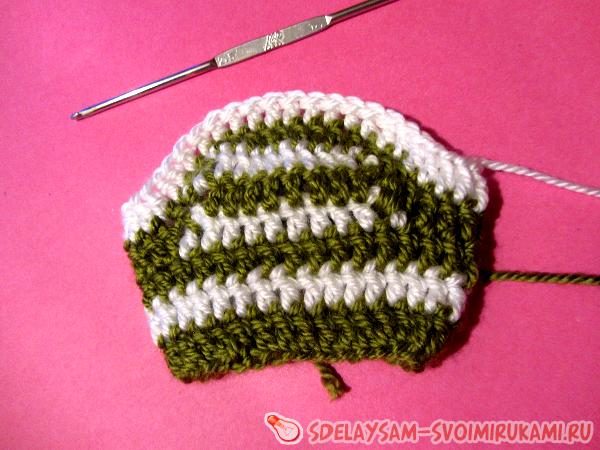 6. Дальше переходим к провязыванию верхней части пинетки крючком. Для этого вяжем белым цветом десять столбиков с накидом. Верхнюю часть вяжем на 10-20 петлях предыдущего ряда.