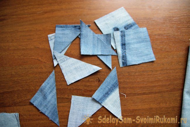 13. Нарезаем полоски из джинсовой ткани. Ширина полос 4 см. Длина равна ширине готового блока.