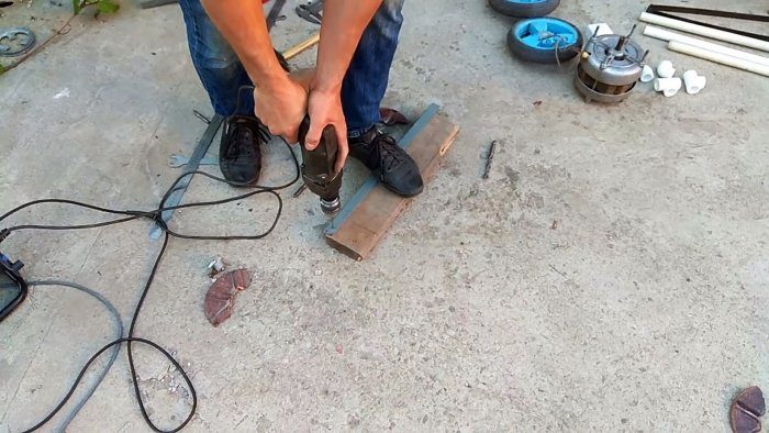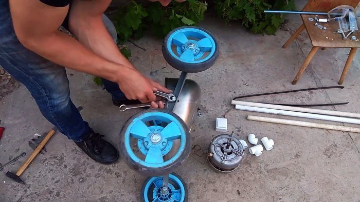 К боковым отверстиям на нижней части дна бака или бочки прикручивается по уголку. По краям уголков делается по отверстию для установки колес на болты. Уголки с колесами зажимаются на базе косилки из бака от стиральной машины с уклоном, чтобы скошенное дно выровнялось в горизонт.