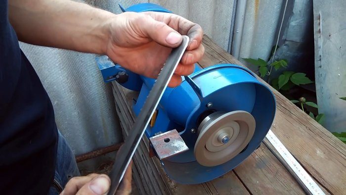 После этого на шпильке между двумя гайками и шайбами зажимается 2 ножа. Их можно вырезать из обломка ленточной пилы или полотна ручной ножовки. В месте зажатия на ножах требуется сделать выборку под шпильку, чтобы они прижались к ней плотнее.