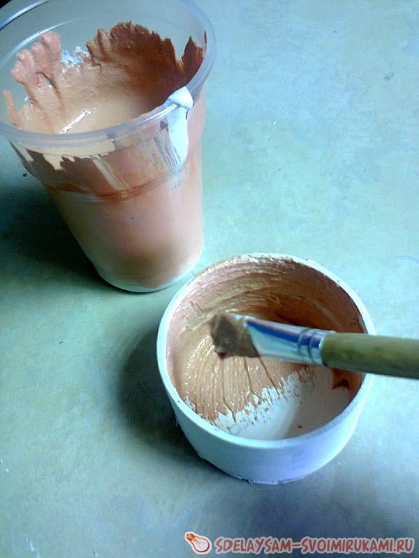 Штукатурка наносится кистью, последовательно, с промежуточным просушиванием. Сначала покрываем внутри и краешек. Затем, когда высохнет, наносим смесь на внешнюю поверхность и оставляем сушить в перевернутом виде. Точно также поступаем и с крышечкой — сначала обрабатываем одну сторону, потом сушим, затем другую.