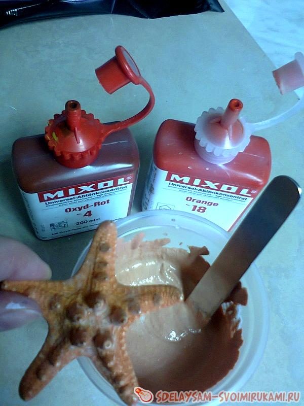 После того, как высох грунт, можно наносить декоративную штукатурку. Она обычно имеет консистенцию густой сметаны, содержащую наполнители, которые после высыхания дают неровную каменистую фактуру. Штукатурку можно сделать цветной, добавив в нее специальные цветные колеровочные пасты, которые продаются в строительных магазинах или обычные акриловые краски. На картинках использованы цветные пигменты немецкой марки MIXOL. Оттенок подбирался под цвет морской звезды, так как изначально цвет шкатулки планировался именно таким.