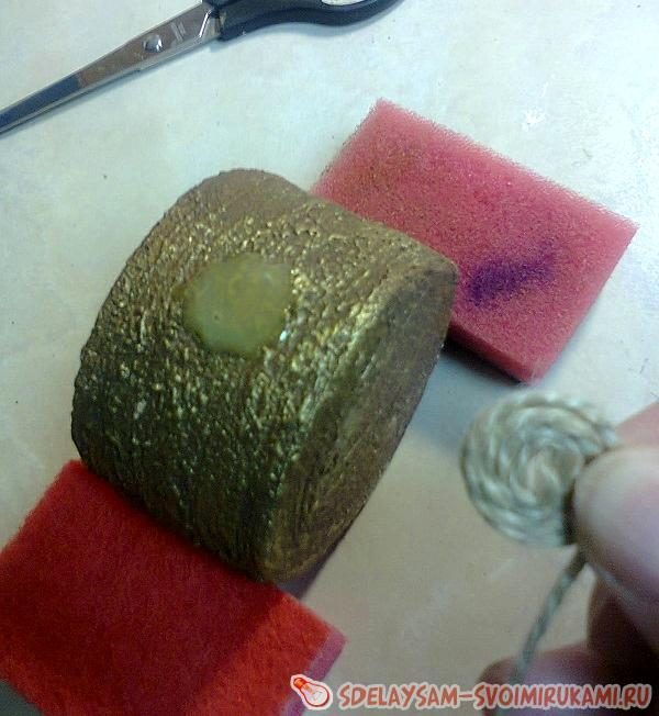 Элементы украшения придумываются на ходу. Пока немного густеет клей, скатываем шпагат, отрезаем ненужное и прижимаем к поверхности.
