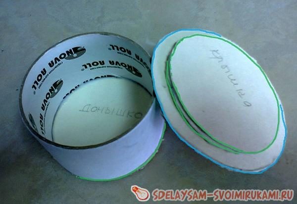 А теперь обводим внутренний диаметр, чтобы получился кружочек, который будет приклеен впоследствии на низ крышки. Он нужен для того, чтобы крышка не соскальзывала со шкатулки. А поскольку мы потом обмажем все изделие штукатуркой, увеличив толщину стенок, то этот кружочек нужно уменьшить, чтобы крышка свободно одевалась на шкатулку. Красным пунктиром показано, на сколько примерно нужно уменьшить окружность и вырезать готовую деталь.