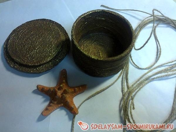 На этом, наверное, можно было бы остановиться. Если же все-таки осталось желание и творческий запал, продолжаем декорировать. Для следующего этапа понадобится какая-нибудь деталь, например, высушенная морская звезда, шпагат, супер-клей.