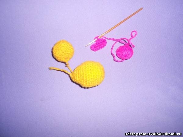 Утят можно связать из жёлтой пряжи крючком столбиками без накида. Каждый утёнок состоит из двух вытянутых шаров – эллипсов.