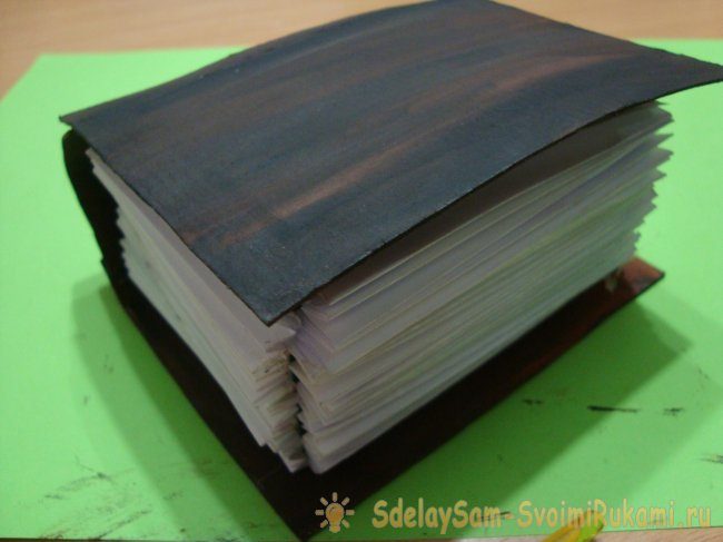 Шаг 12. Теперь займемся страницами. Берем полоски, загнутые гармошкой. Коробочку от сока необходимо намазать клеевым пистолетом. При отсутствии клеевого пистолета можно использовать клей Момент. Полоски, которые более широкие приклеиваем в длину книги, а более узкие приклеиваем по ширине. Старайтесь приклеивать слои друг за другом как можно плотнее друг к другу. Если полосок не хватит, дополнительно можно еще начертить, загнуть гармошкой и использовать. Напомню размеры для полосок в длину книги 8,5 см и в ширину 6,3 см.