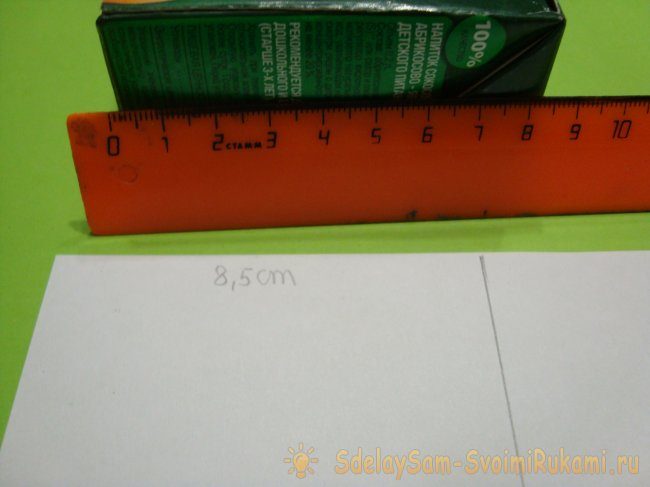 Шаг 5. Сделаем страницы. Для этого возьмем белый лист бумаги. Измерим коробочку от сока в длину (длина данной коробочки составляет примерно 8 см + еще 5 мм – это будут припуски для склеивания), чертим прямую линию вниз до конца листа и вырезаем. Таких полосок должно получиться примерно 5 шт.