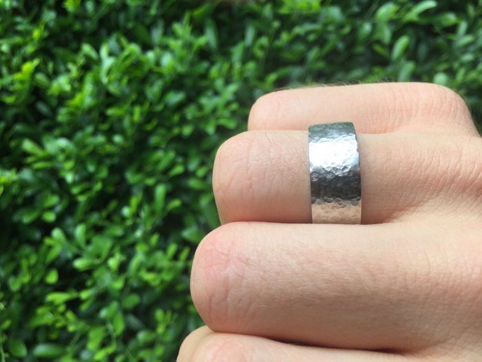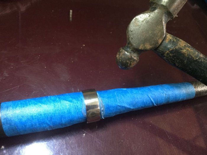 Наматываем на оправку полиэтиленовую пленку, помещаем на нее кольцо и перемещаем его по стержню до плотной посадки. Затем молотком с полусферическим бойком начинаем снаружи оббивать кольцо для получения кованой текстурированной поверхности. После этого подшлифовываем края кольца, и оно готово для носки.