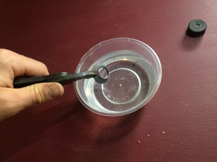 Чтобы легче было обрабатывать монету, отпускаем ее, нагревая в пламени газовой горелки до ярко-красного свечения, и охлаждаем в воде.