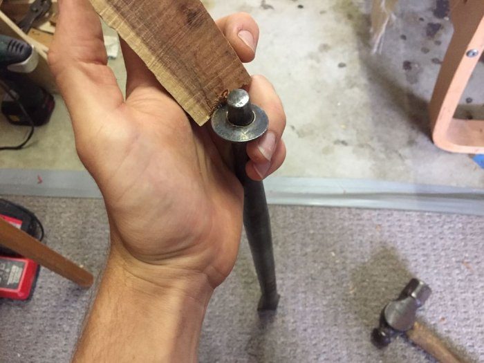 Установив монету на оправку, начинаем молотком ударять по деревяшке, упертой в монету, и продвигать ее по стержню, увеличивая размер отверстия, но при этом происходит и упрочнение металла.